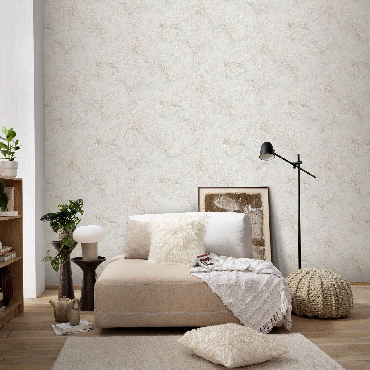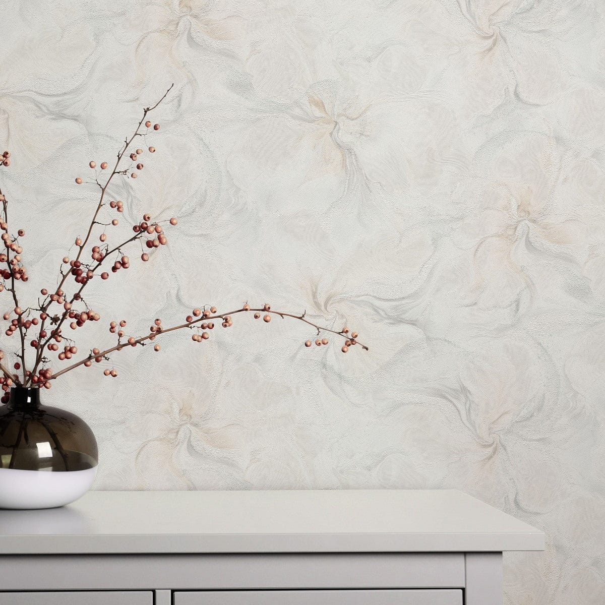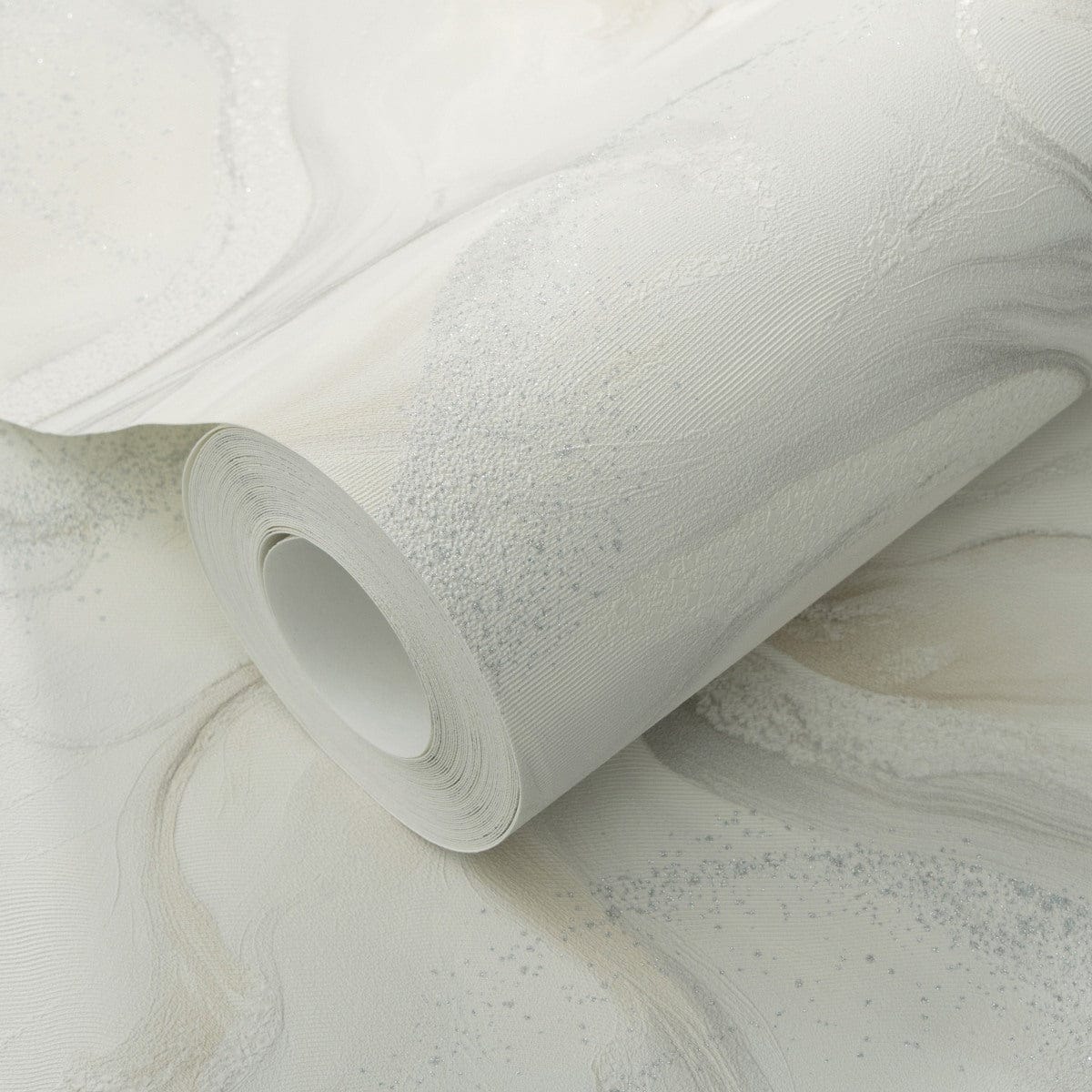 Elegantiška akmens imitacija. Šviesiai pilkos ir baltos spalvos organiniai marmuro sūkuriai su blizgesio efektu suteikia kambariui prabangos ir šaltos elegancijos.