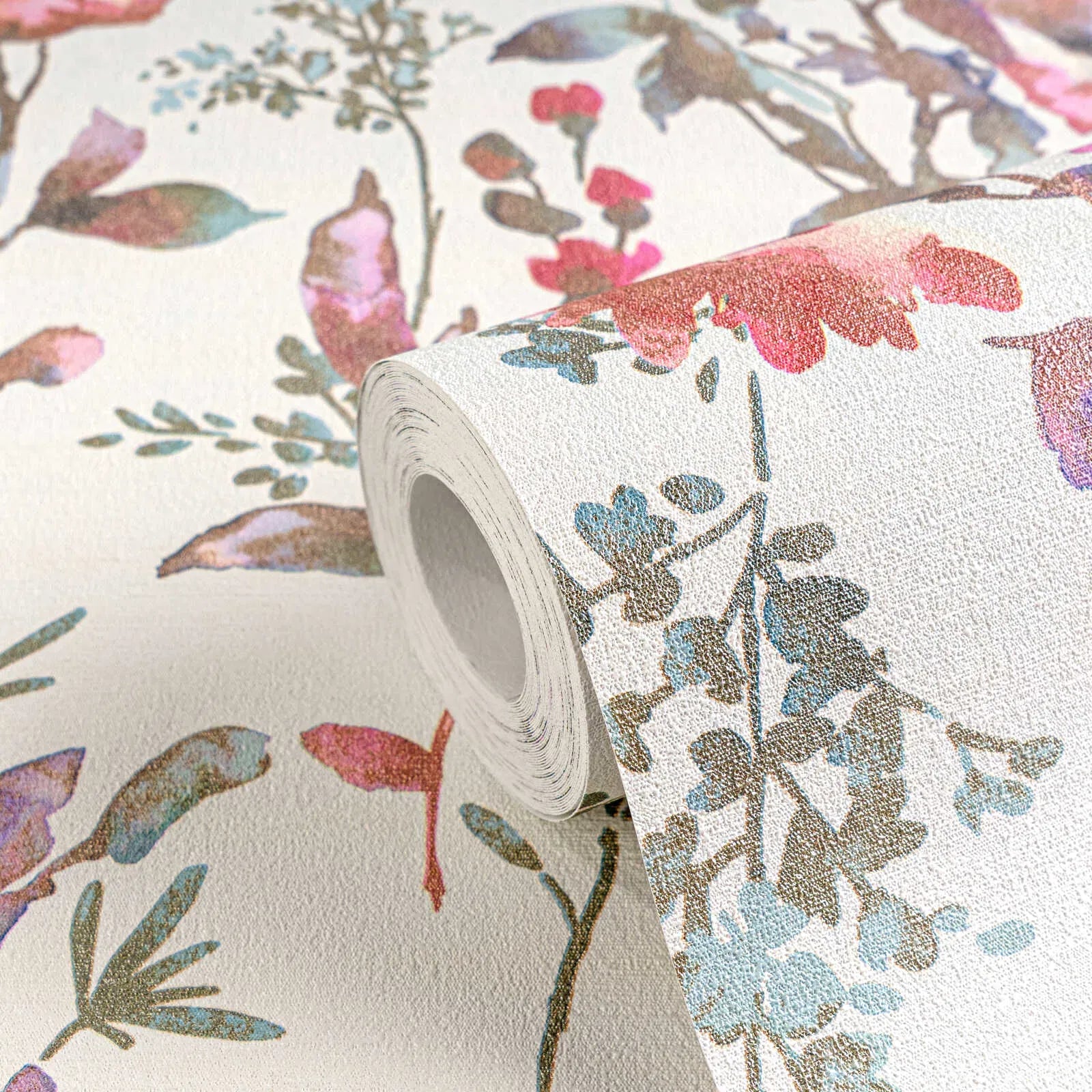 Delikāti akvareļu ziedi rozā, rožu un violeta toņos veido šo tapetu rakstu, kas mijas ar saules dzelteniem un pasteļoranžiem ziediem. Ziedu motīvi ir izkliedēti un nedaudz pārklājas uz gaiša, gandrīz balta fona, kas visam piešķir svaigu, gaisīgu izskatu. Smalki lapas un delikāti zari pelēkzaļā un gaiši zilā krāsā papildina ziedu kompozīciju un piešķir tai dziļumu un vieglumu. Tapetes motīvs ir moderns, taču romantisks un sievišķīgs, iedvesmojoties no mūsdienu akvareļu glezniecības. Harmoniska, maiga krāsu gamma rada draudzīgu, dzīvīgu efektu un telpā ievada rotaļīgu, pavasara atmosfēru.