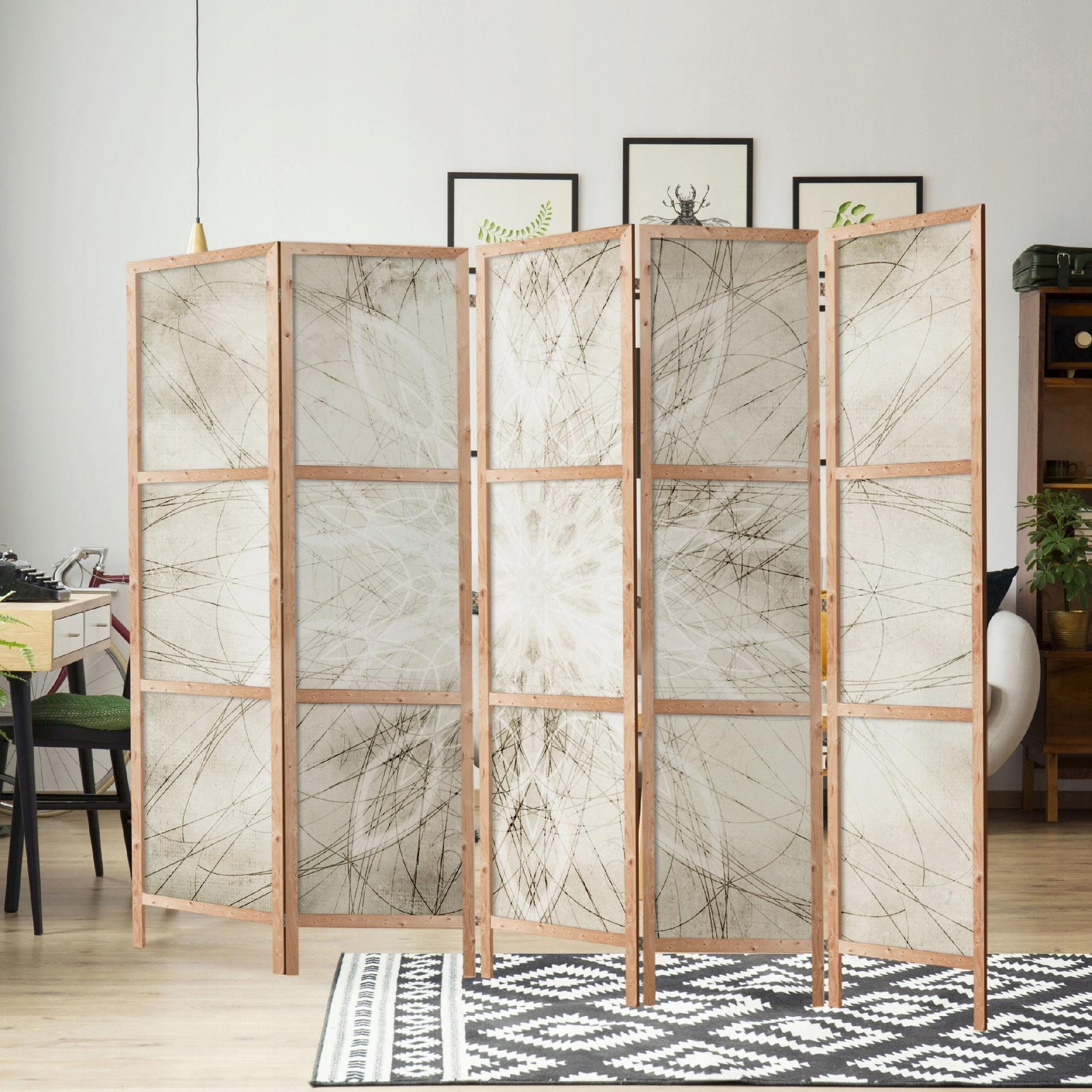 Dydžiai: 135 x 172 cm (3 dalių širma) arba 225 x 172 cm (5 dalių širma).