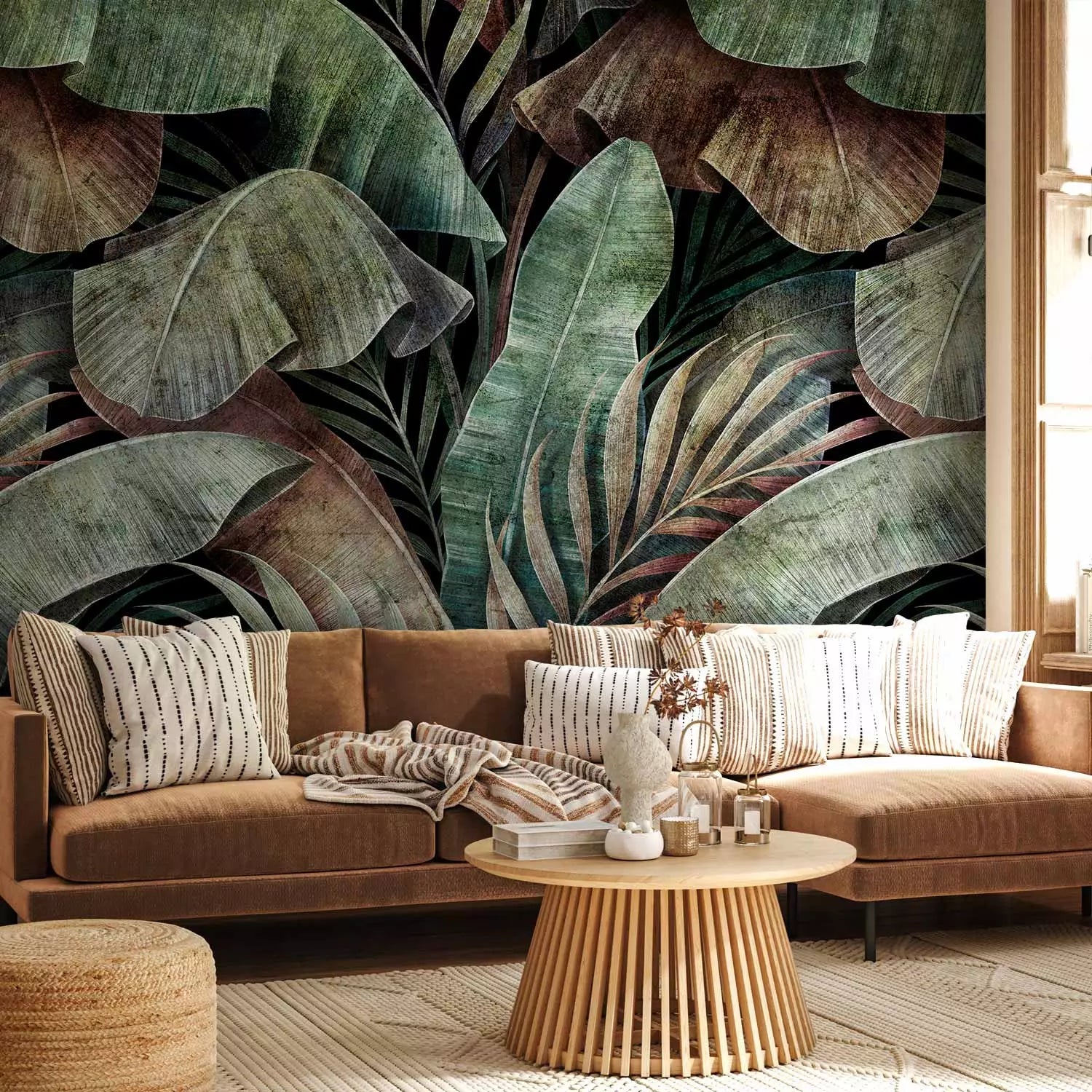 Tropiniai fototapetai – žalios palmių ir bananų lapai ant tamsaus fono, 146366