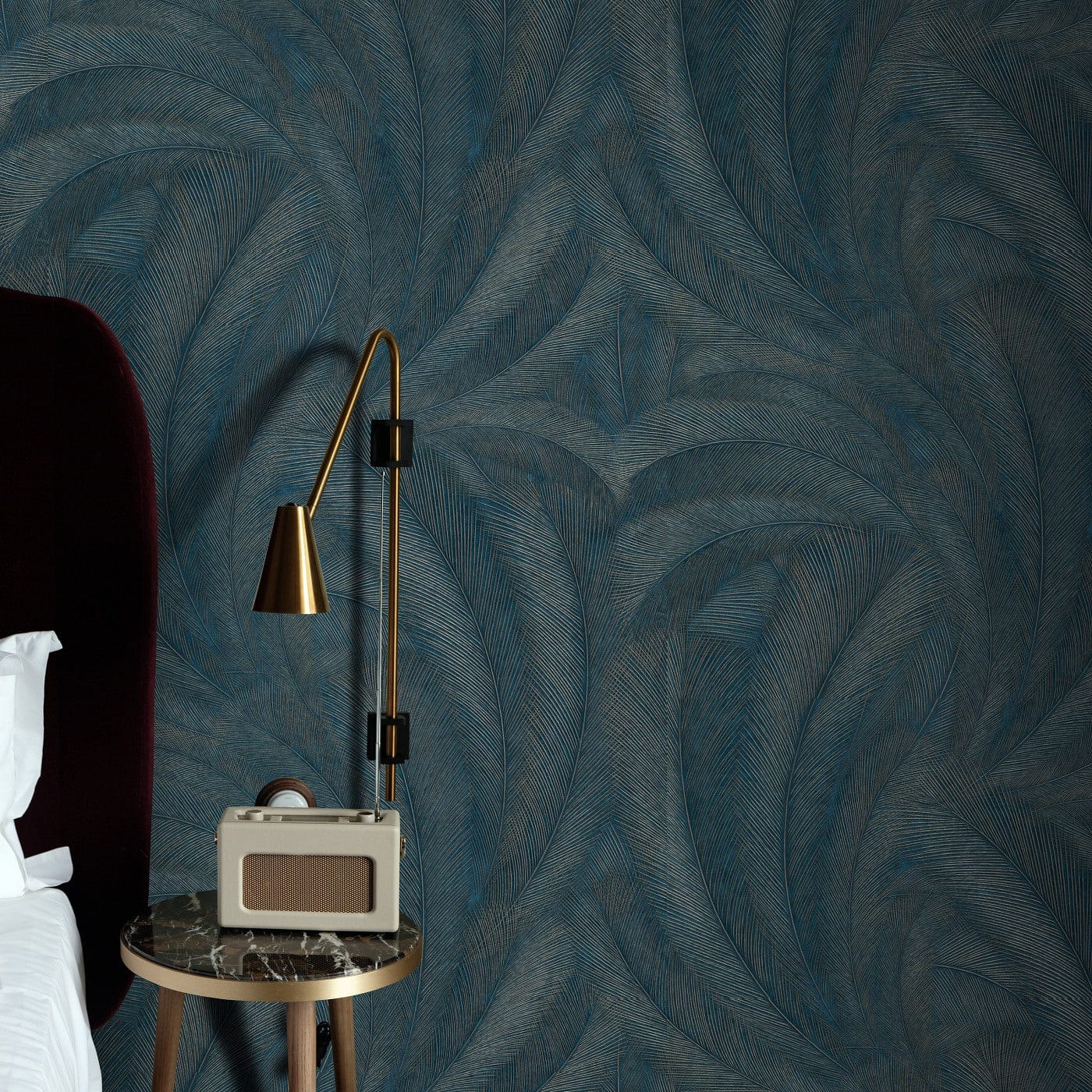 Kontrastų žaidimas. Tamsiai mėlynas fonas su aukso ir turkio spalvos lapų elementais sukuria išskirtinę ir menišką išvaizdą.