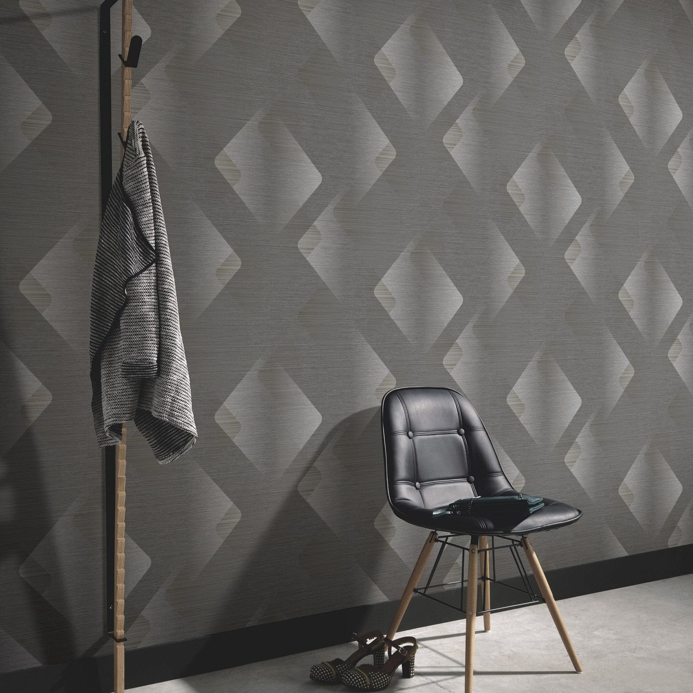 Šiuolaikinis straipsnis. Tamsiai pilkas fonas su žvilgančiais elementais yra puikus fonas minimalistiniams baldams.