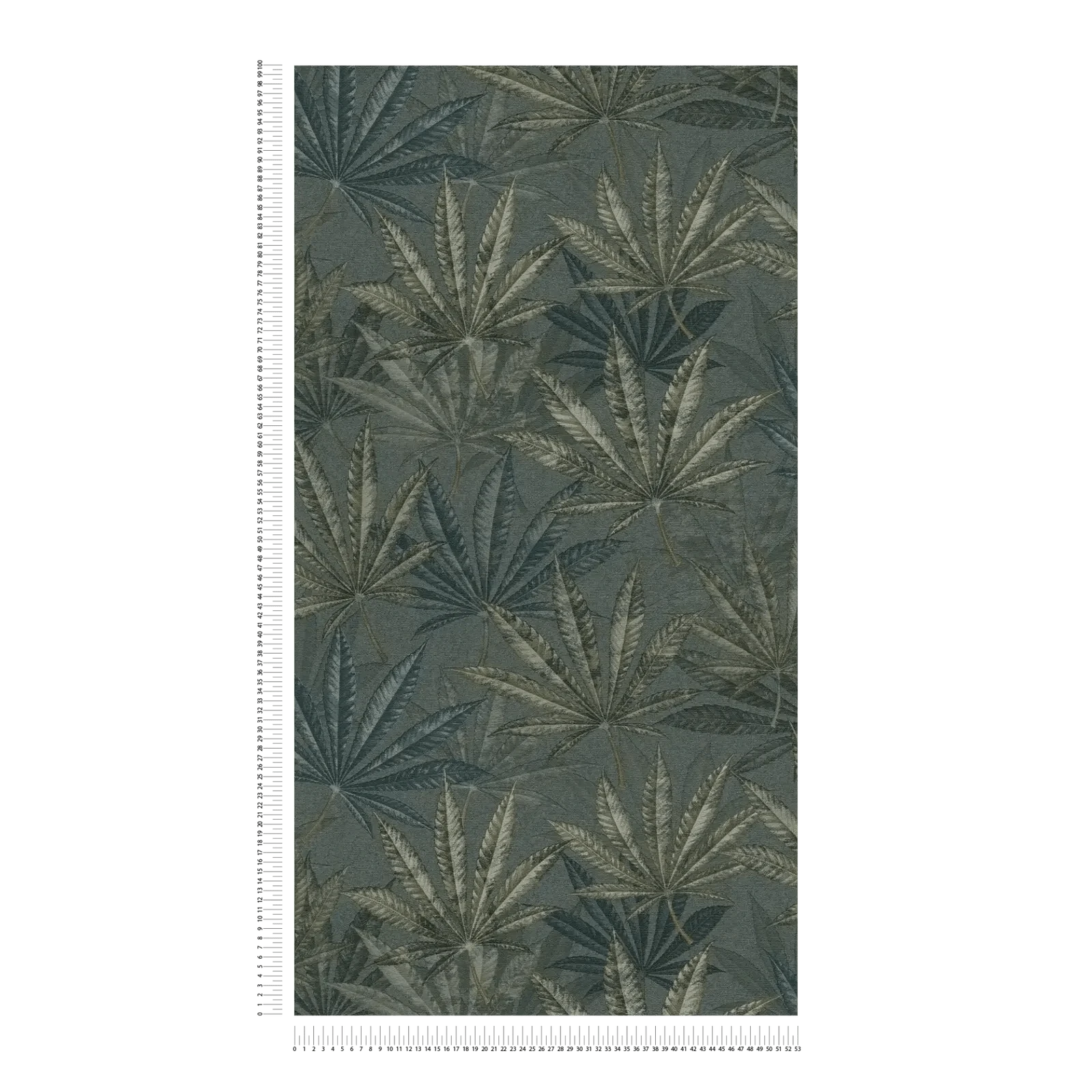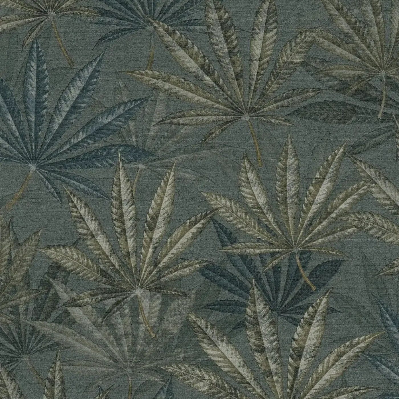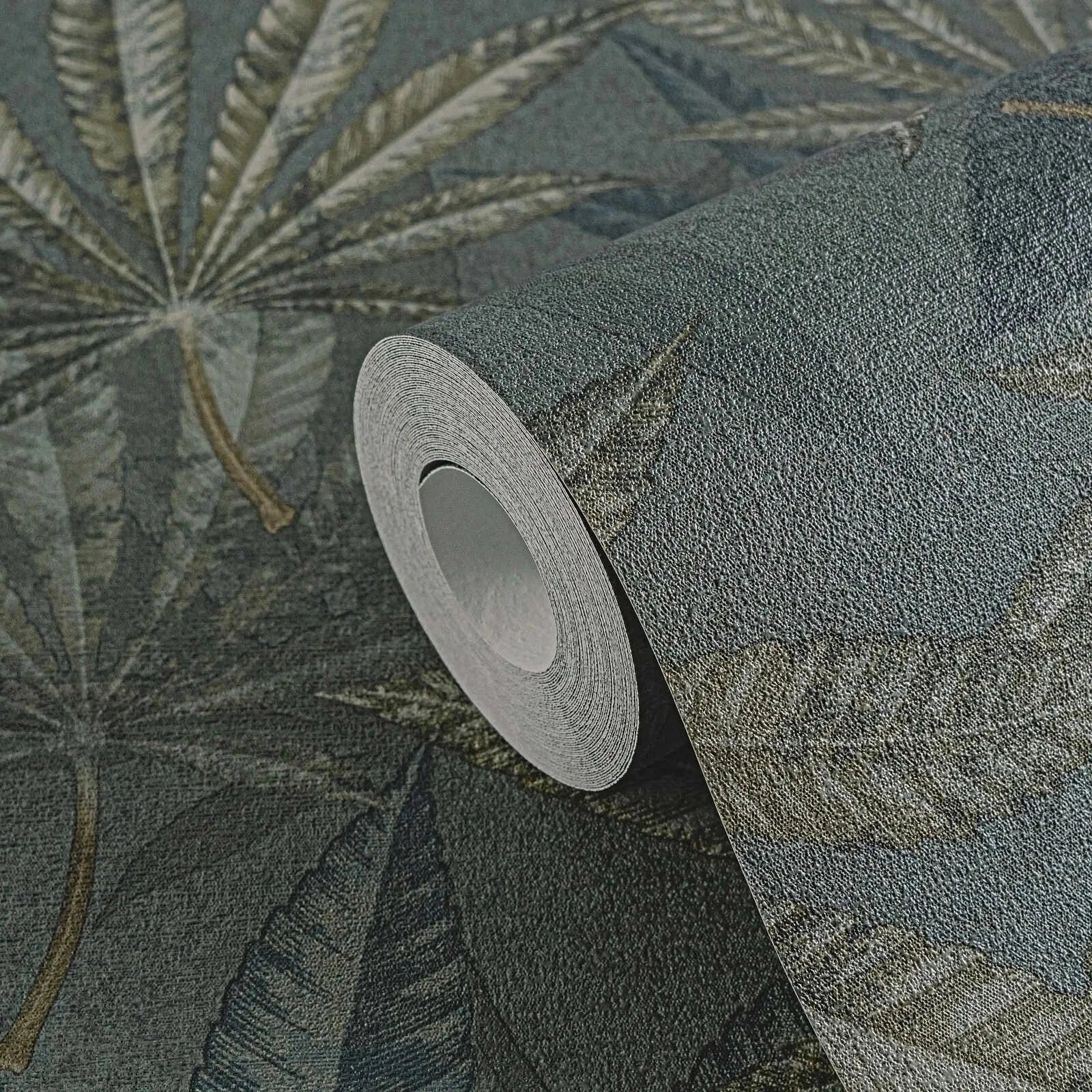 Tamsiai žali Flizelininiai tapetai su džiunglių stiliaus lapų raštu sukuria tropiškai intensyvų ir prabangų efektą.