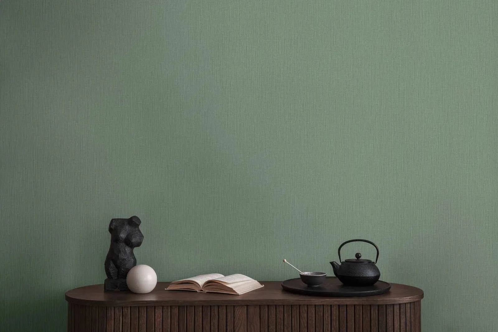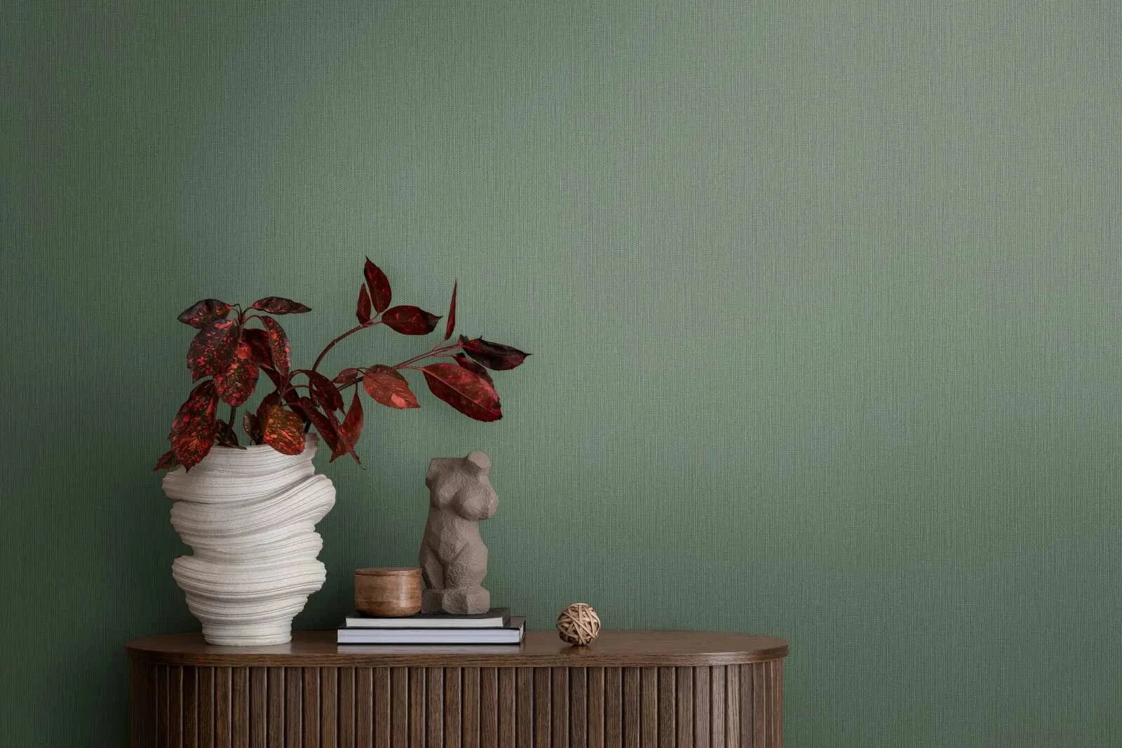 Tamsiai žali Flizelininiai tapetai su audinio efektu suteikia kambariui prabangos ir natūralumo.