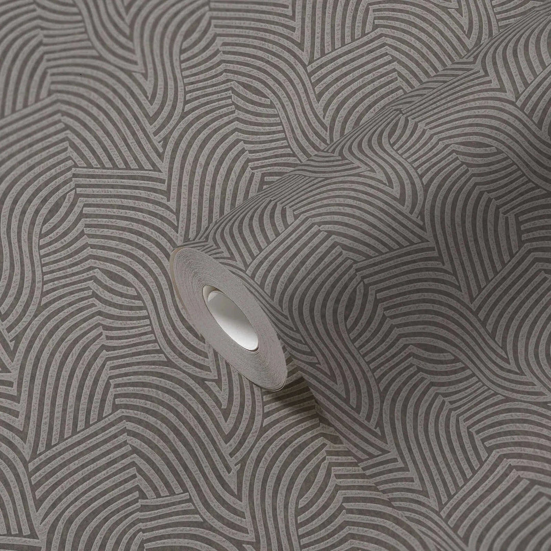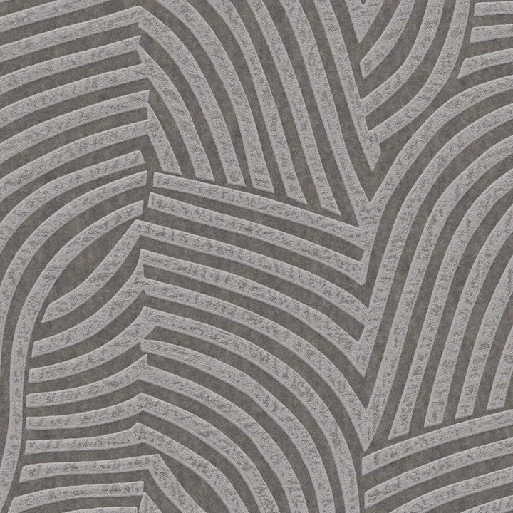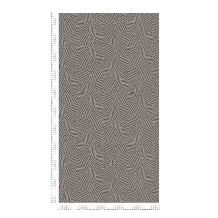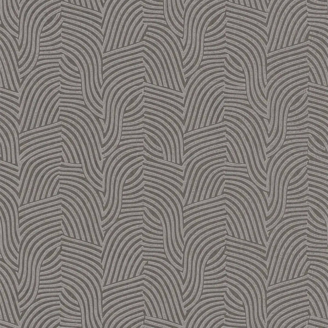Daniel Hechter tumši pelēkas tapetes ar abstraktu viļņotu līniju rakstu piešķir telpai modernu un stilīgu izskatu.
