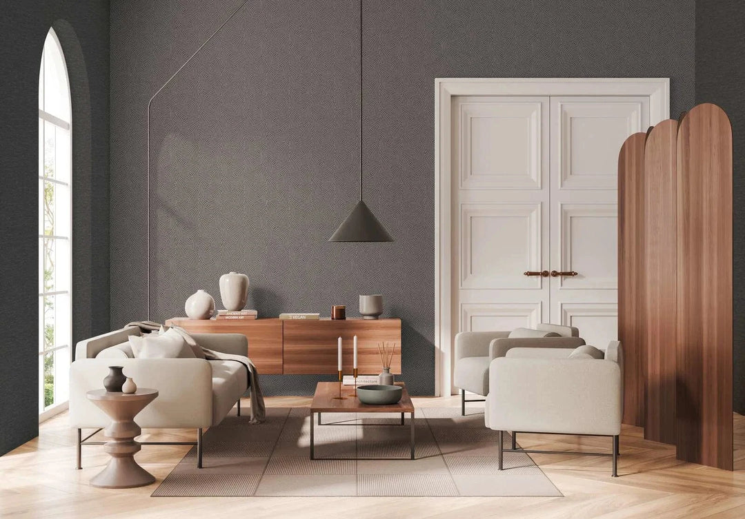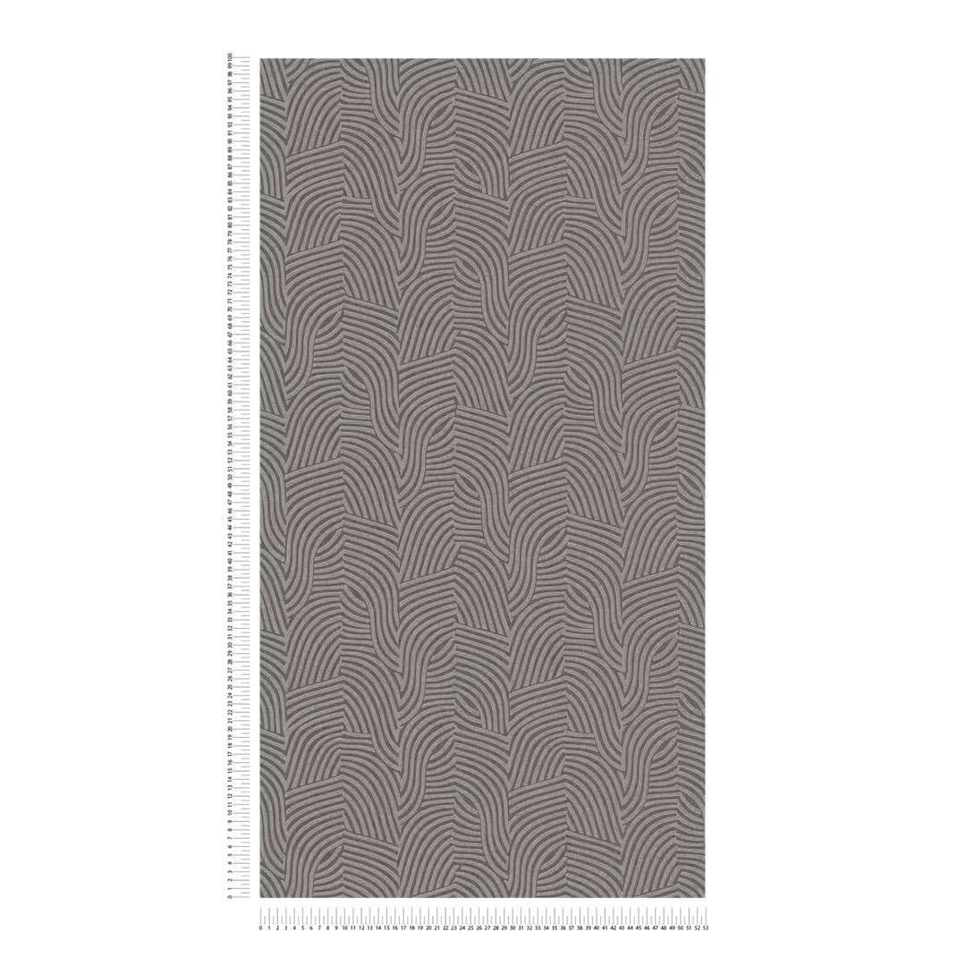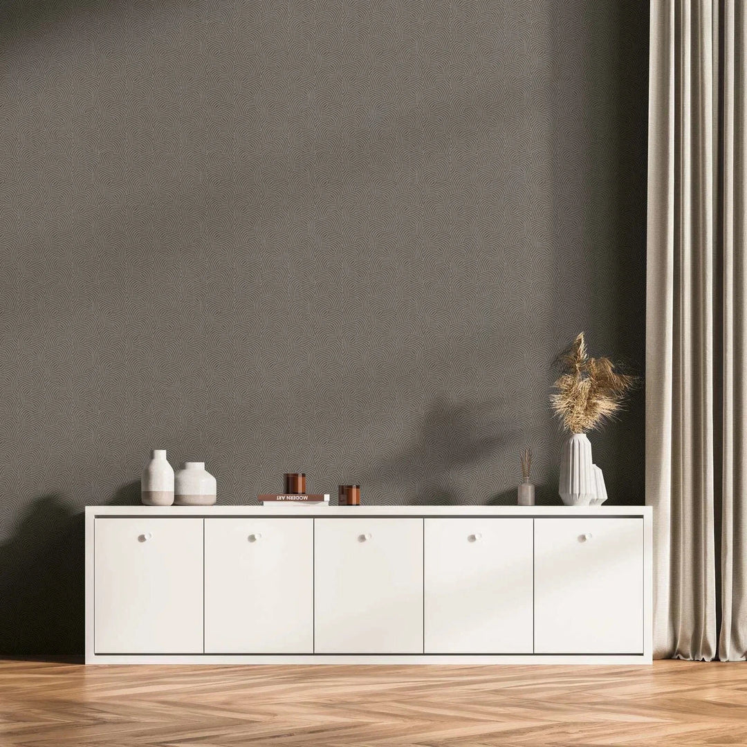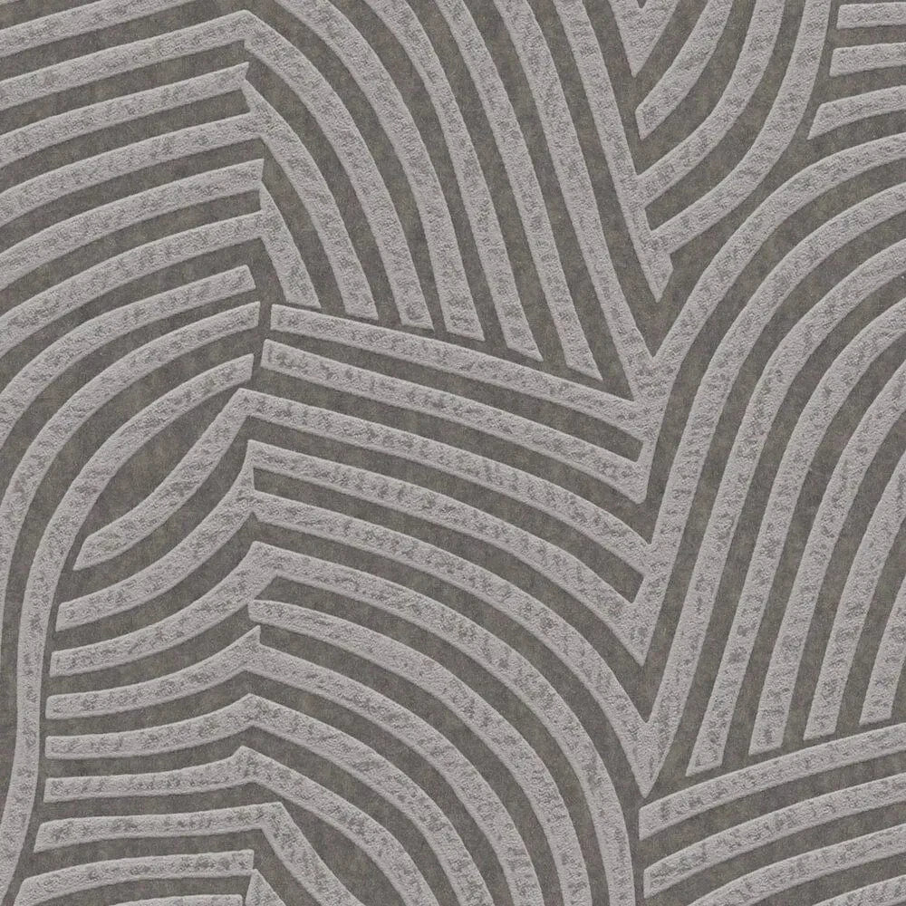Daniel Hechter tumši pelēkas tapetes ar abstraktu viļņotu līniju rakstu piešķir telpai modernu un stilīgu izskatu.