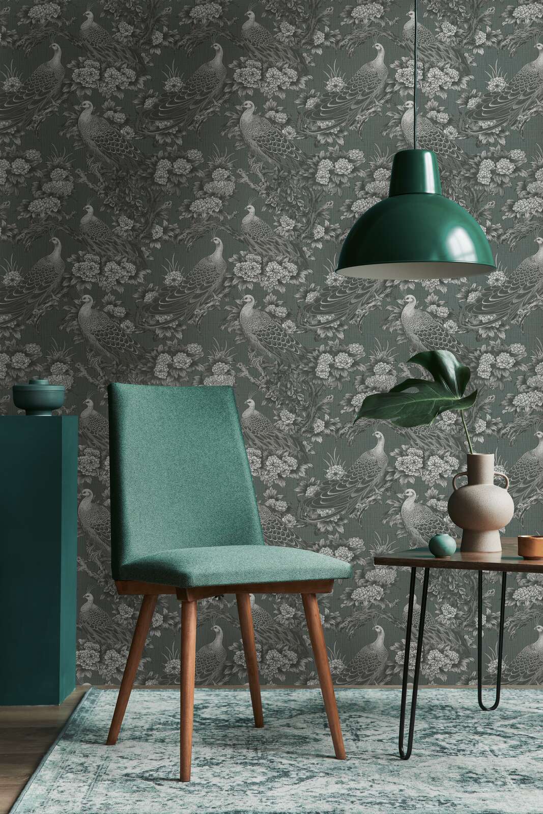 Flizelīna tapetes ar tumši zaļiem ziedu motīviem angļu lauku mājas stilā piešķir telpai mājīgumu un klasisku eleganci.