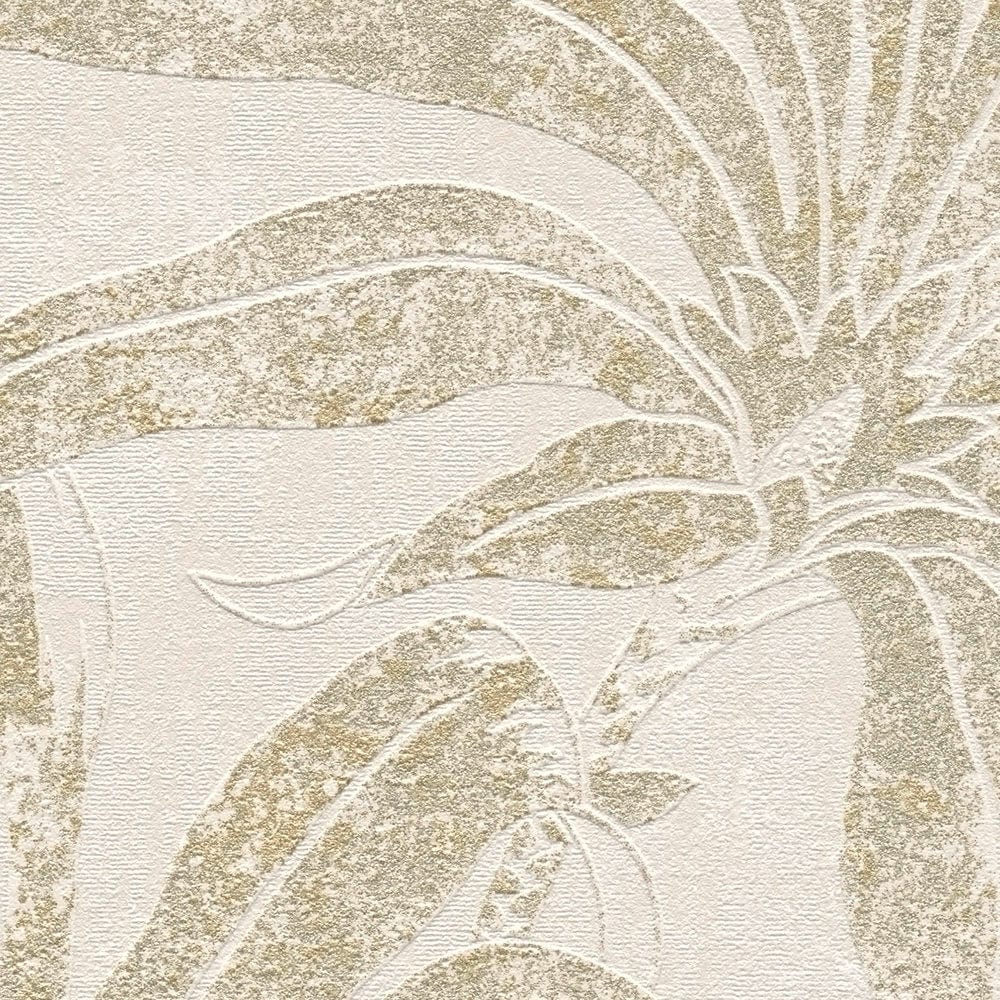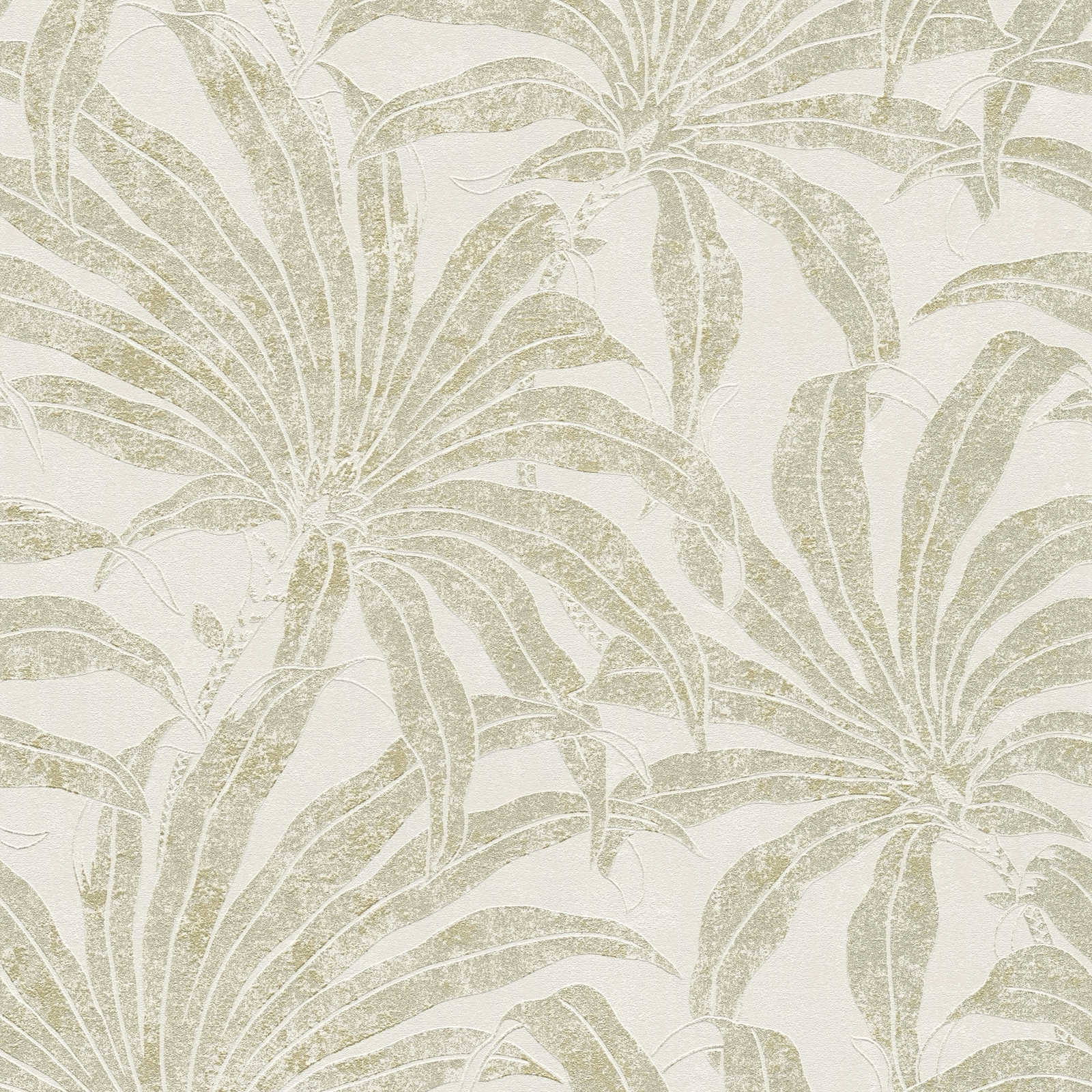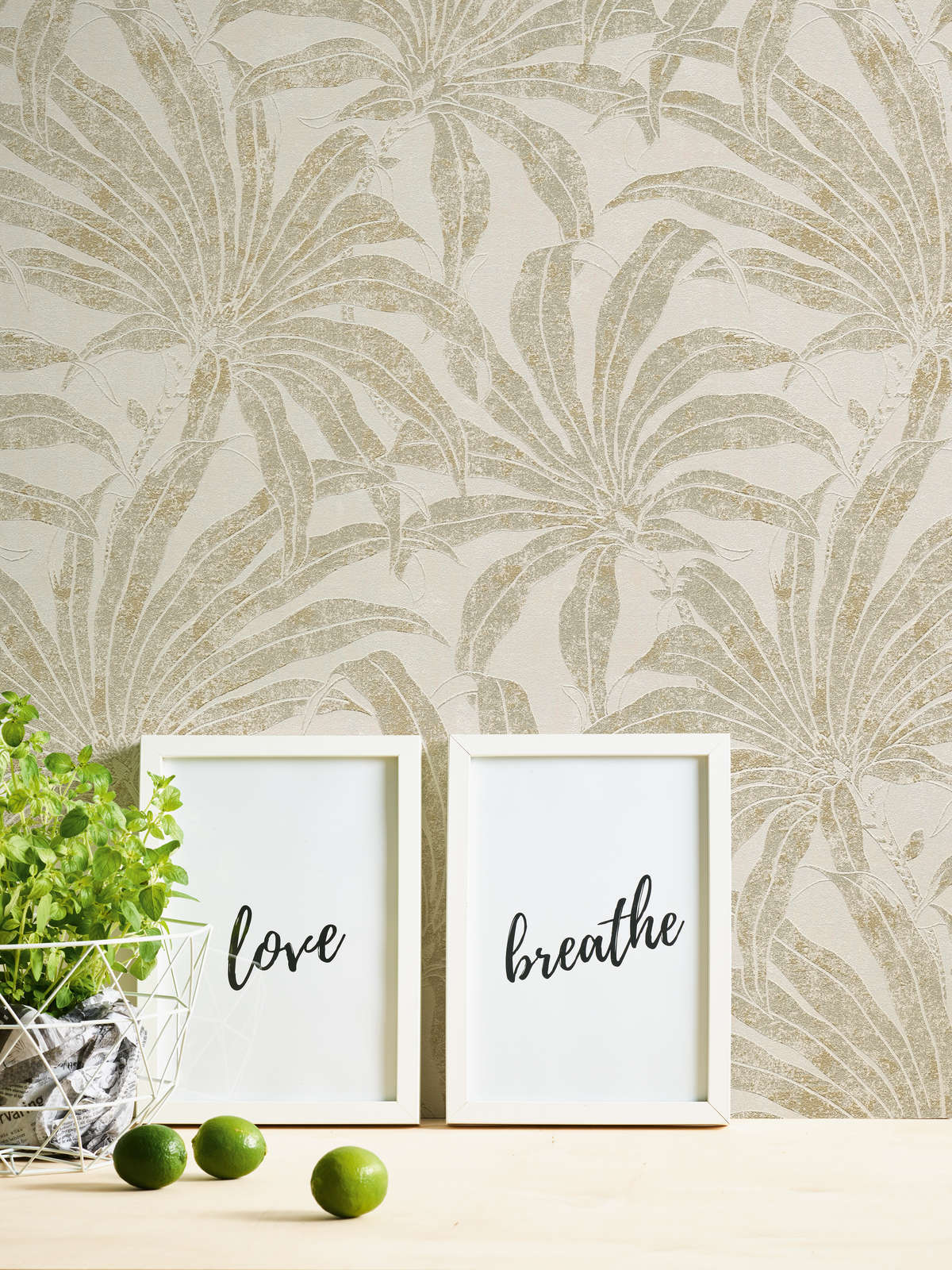 Tapetes ar džungļu lapām: bēšā un zeltā krāsā, 1403407