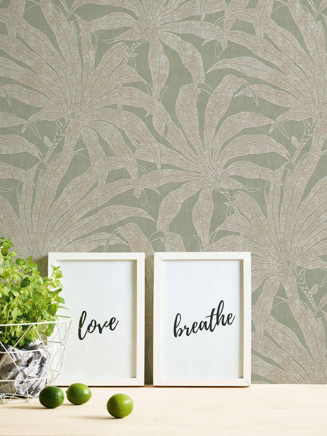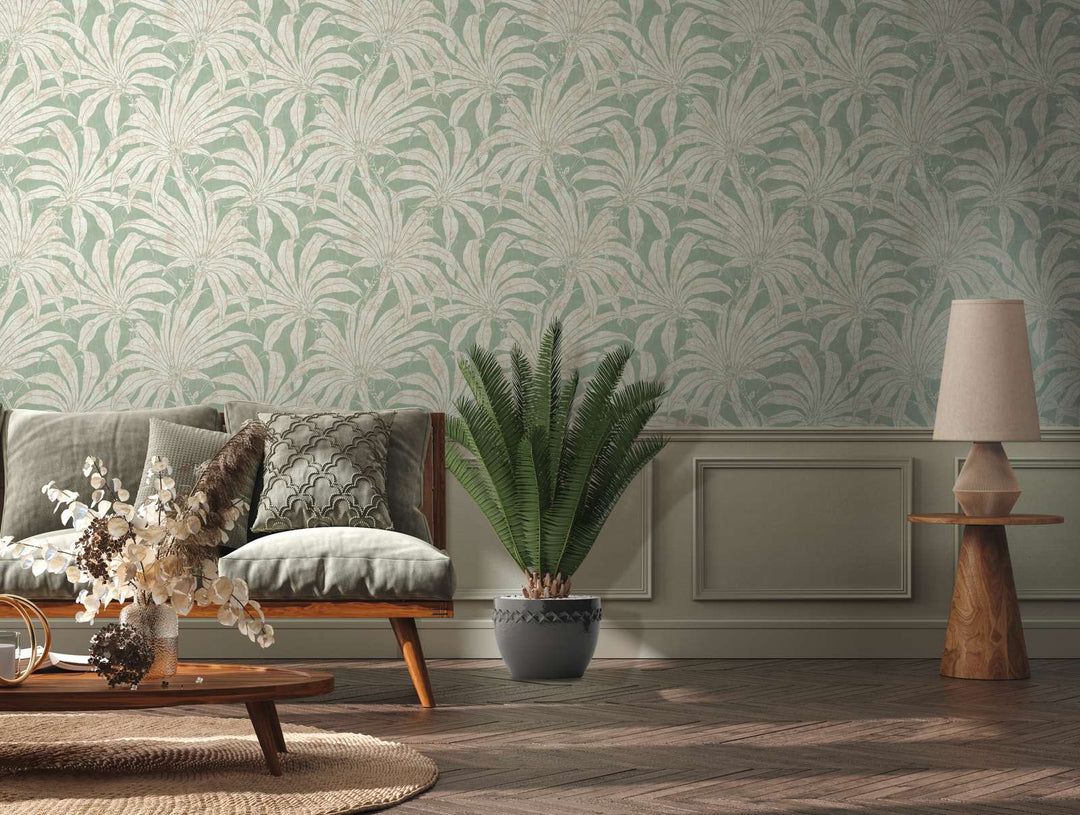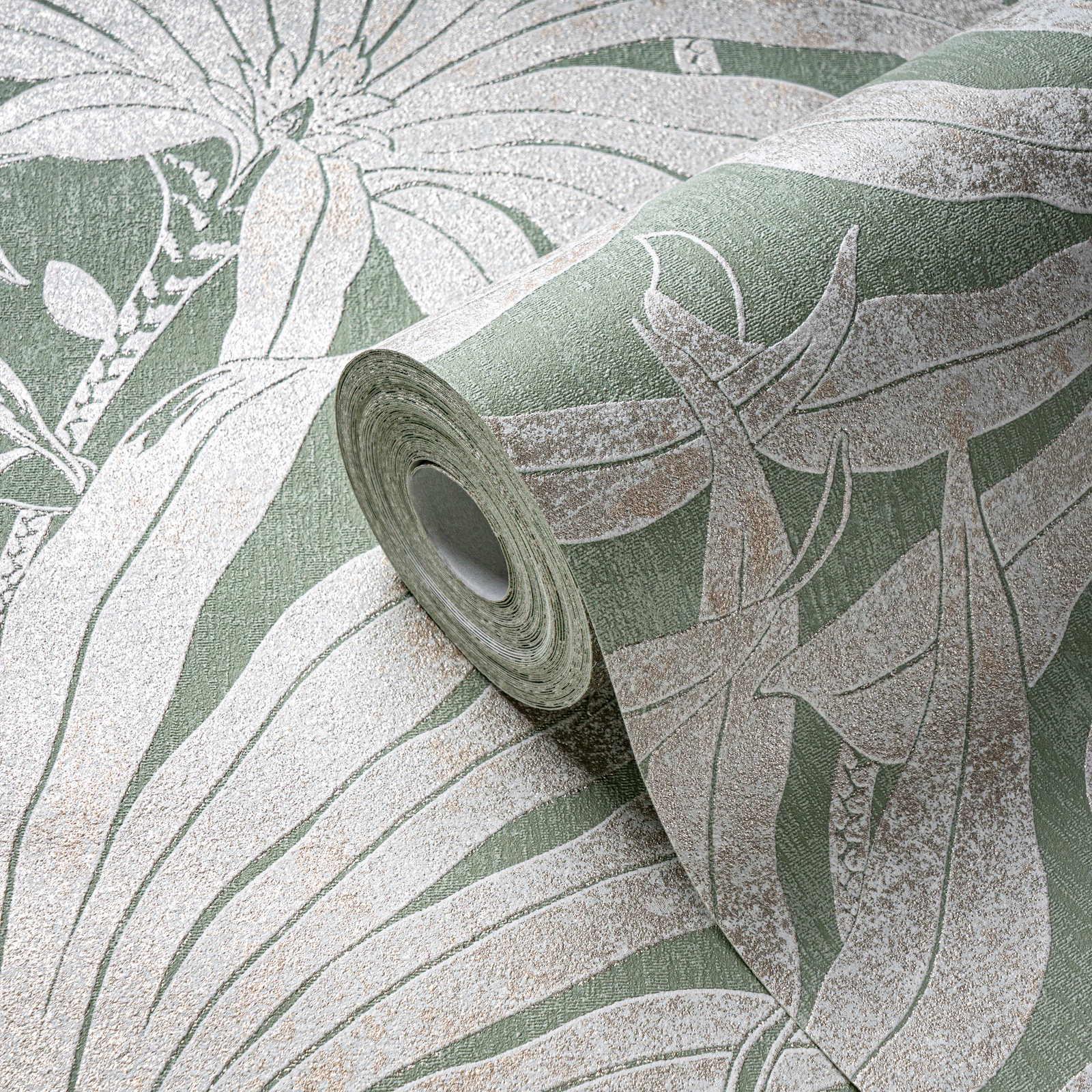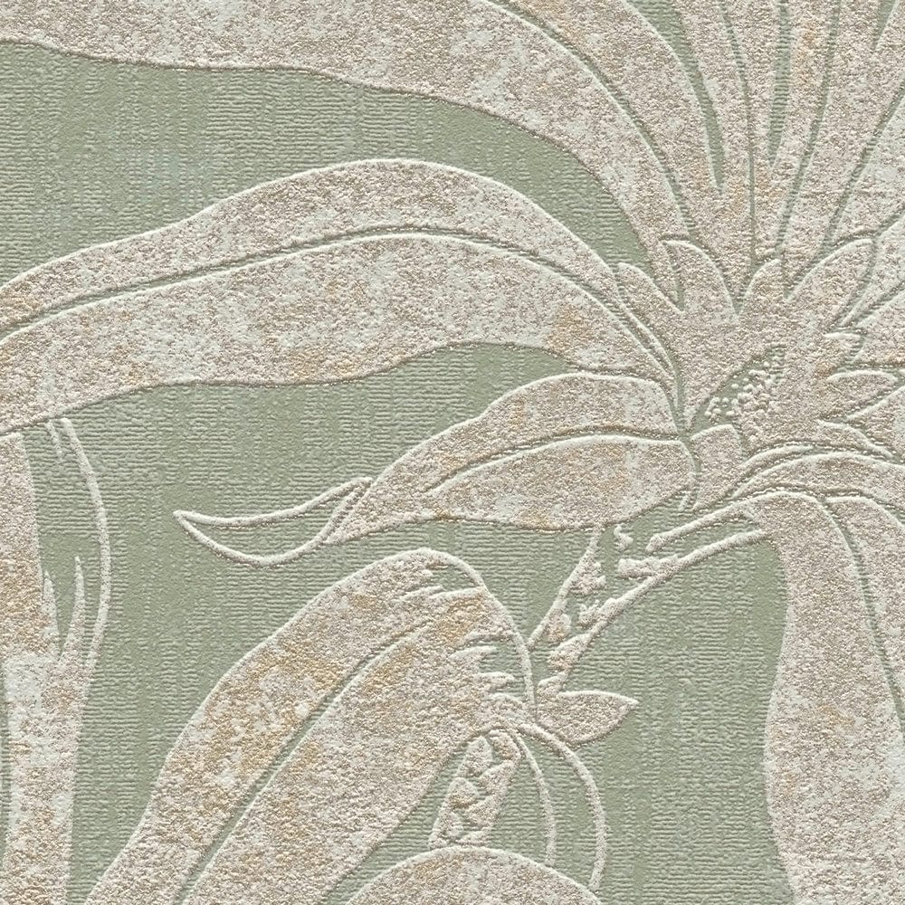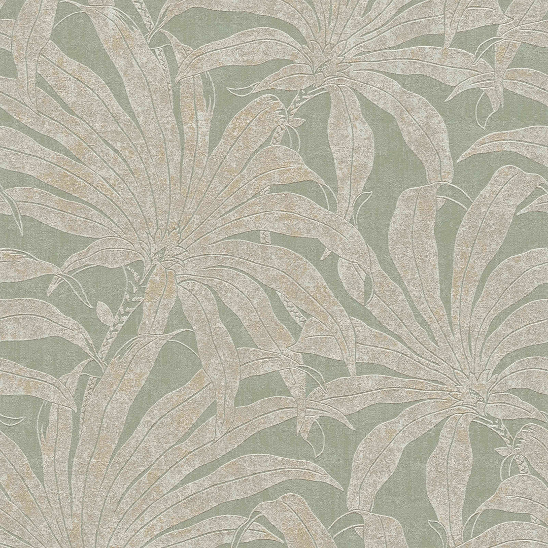 Tapetes ar džungļu lapām: zaļa, zelta, sudraba, 1403404