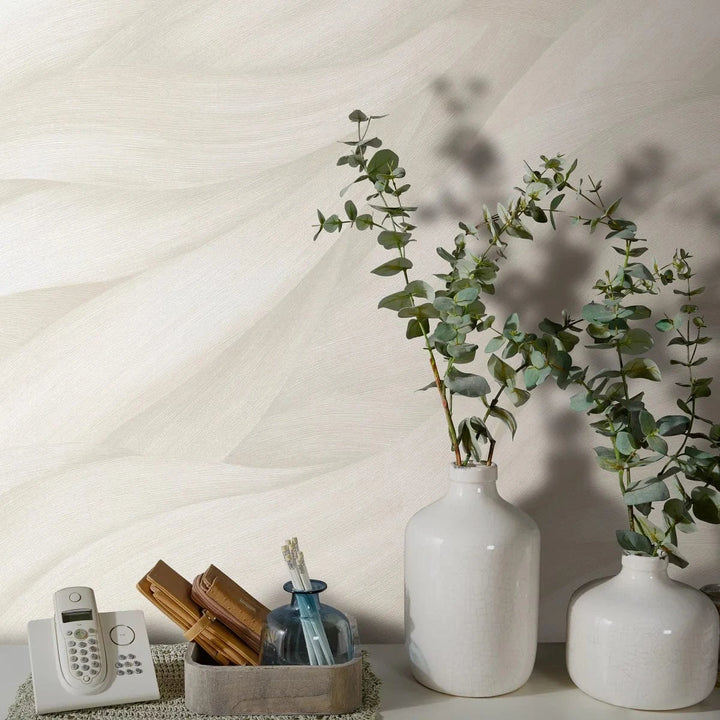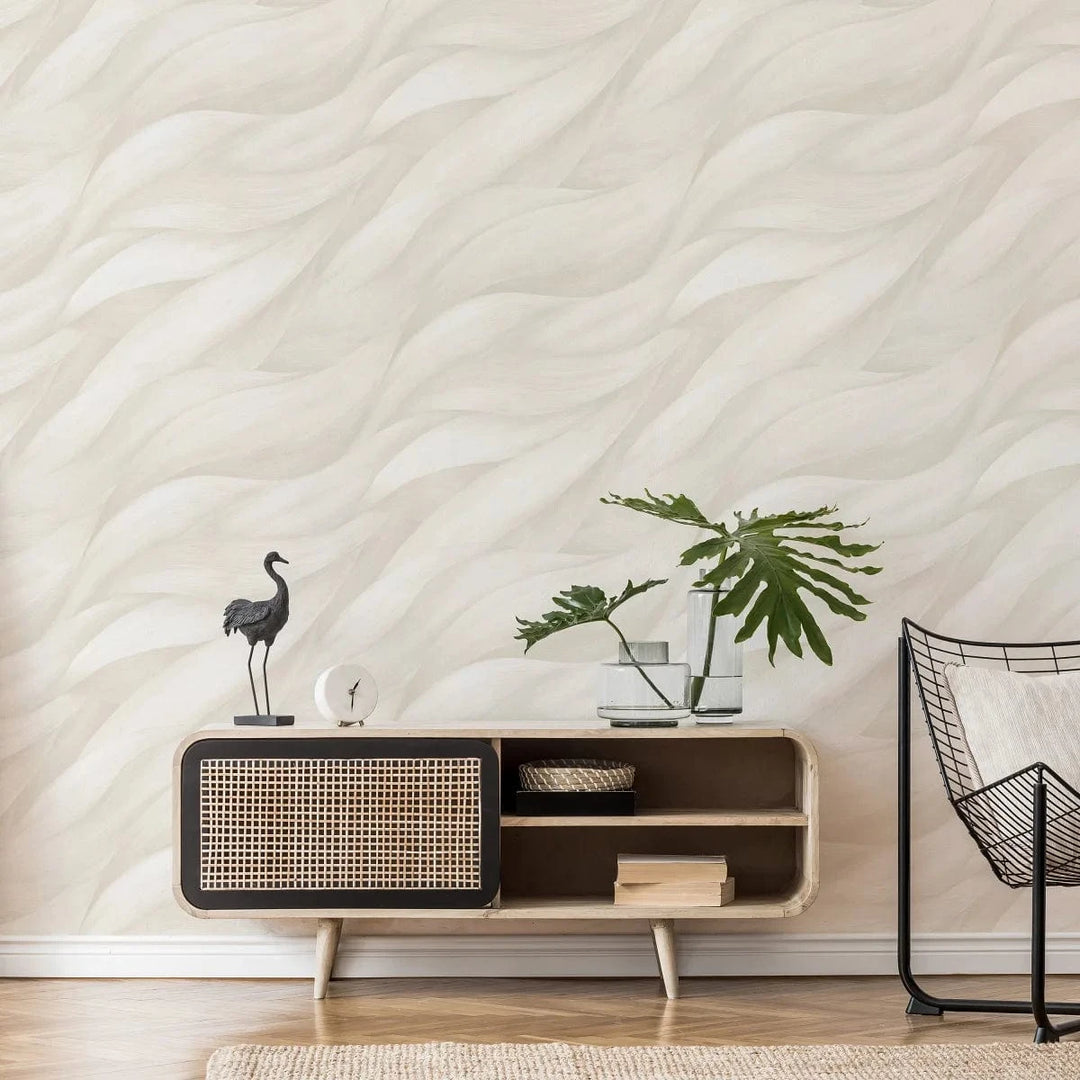 Gaišu toņu viļņveida tapetes veido gaisīgu un elegantu interjera fonu.