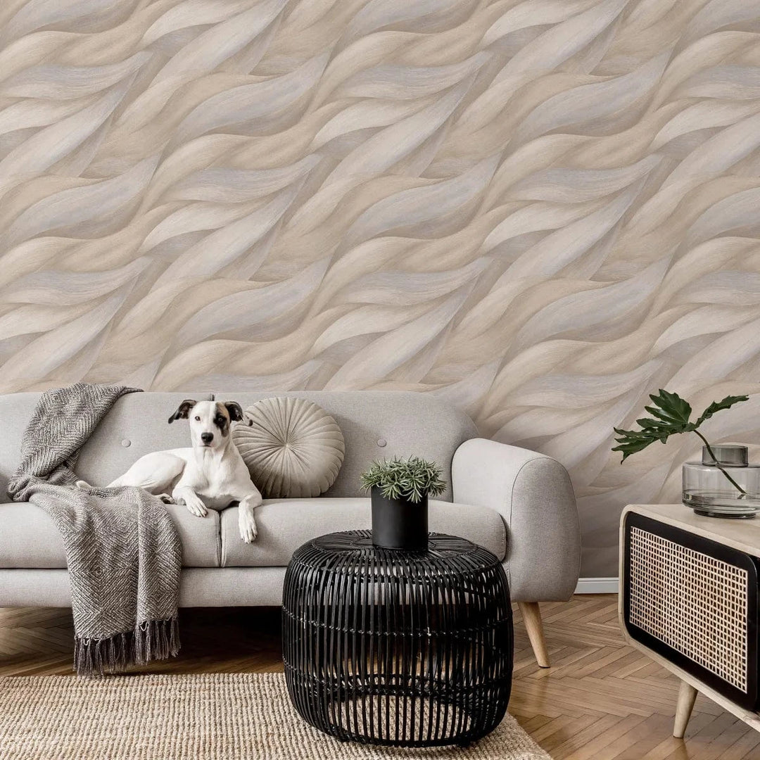Taupe un bēšās viļņveida tapetes ir ideālas neitrālam un modernam sienu risinājumam.