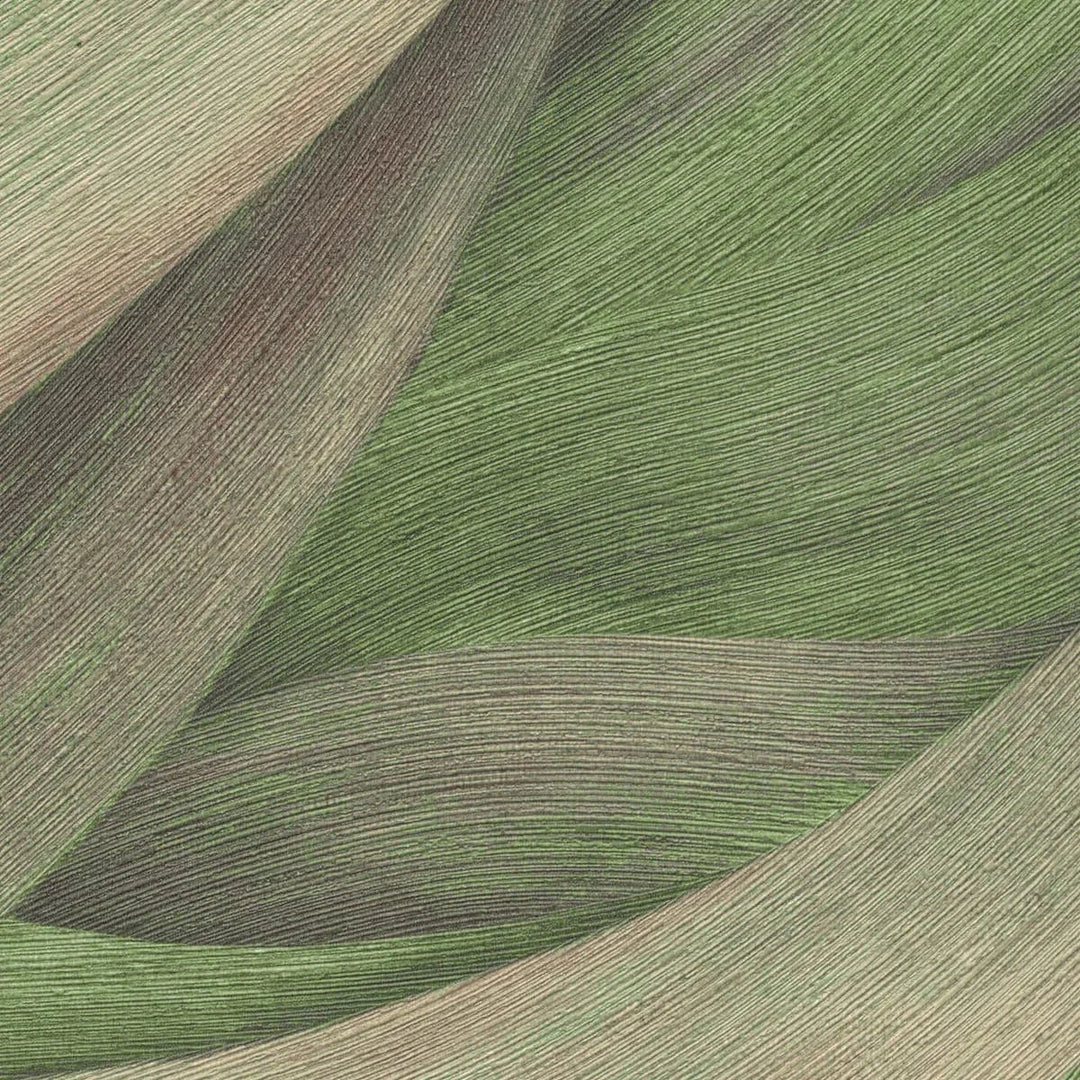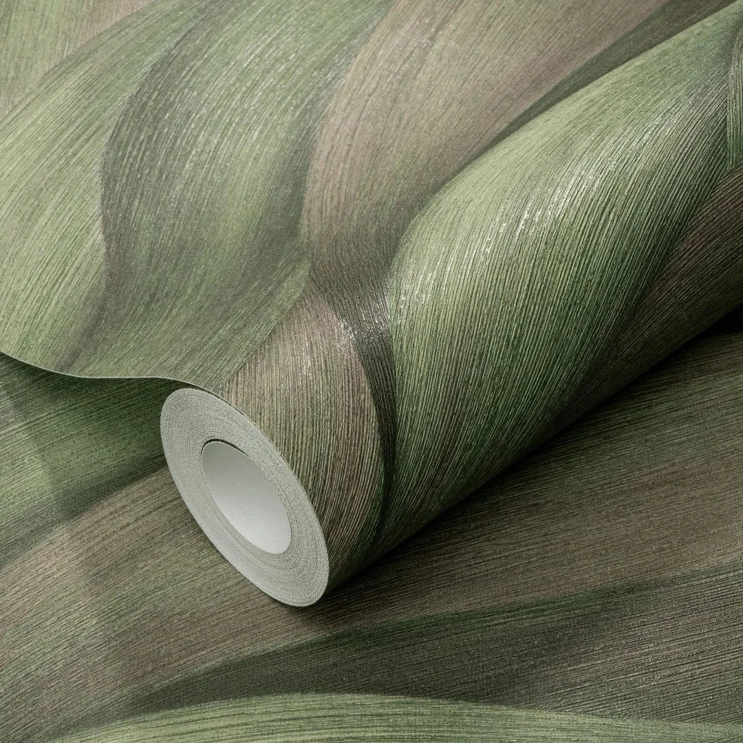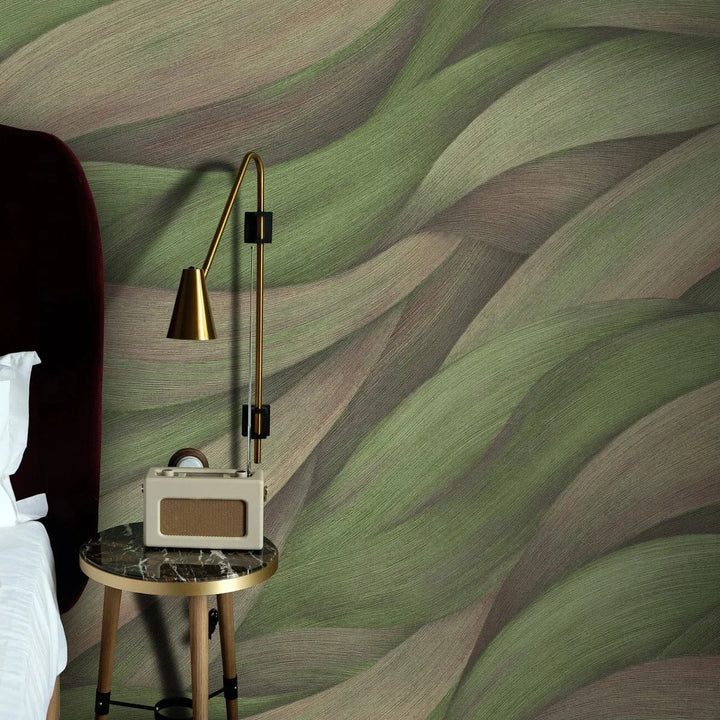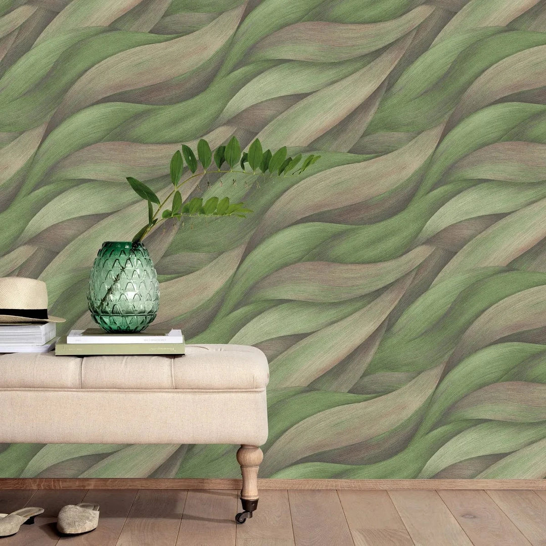 Zaļas tapetes ar viļņveida rakstu ienes svaigumu un dabiskumu jebkurā telpā.