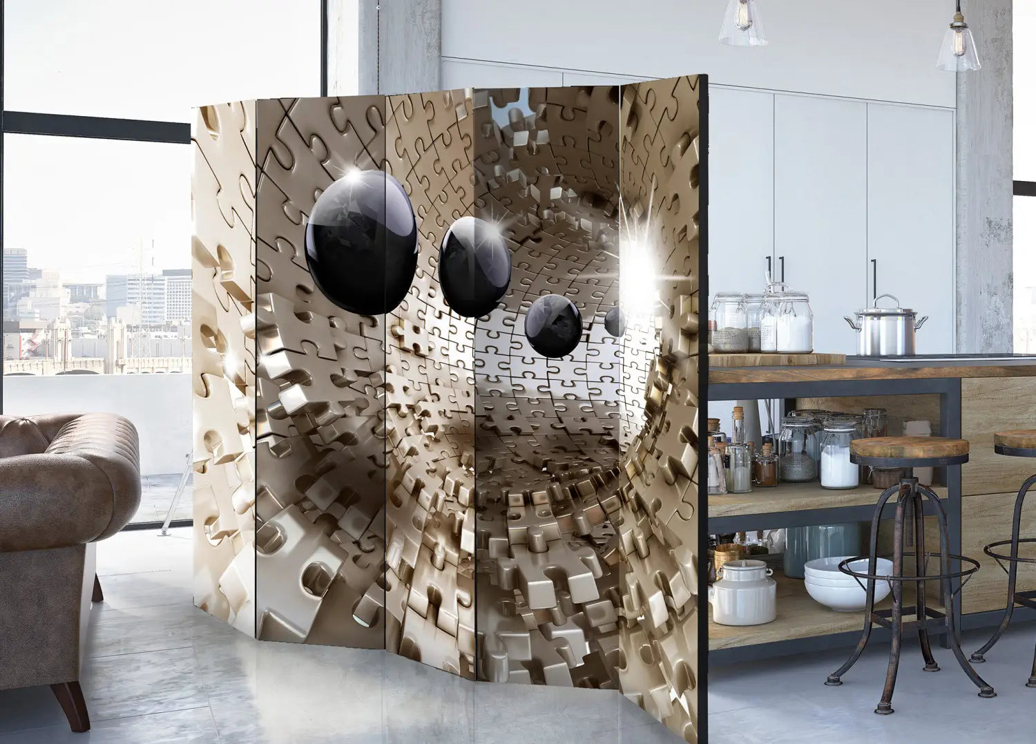 Этот вариант идеально подходит для тех, кто хочет разделить пространство, сохранив целостный вид интерьера, и скрыть предметы, которые не используются (например, сушилка для белья, ящики с детскими игрушками, офисное оборудование).