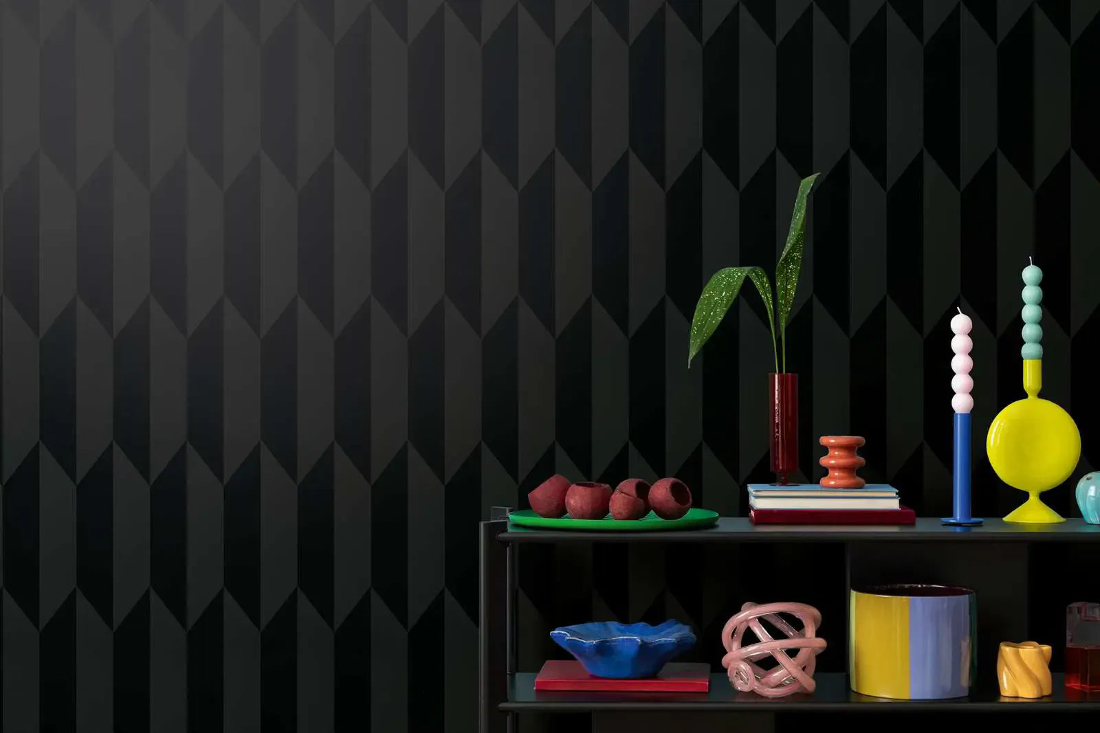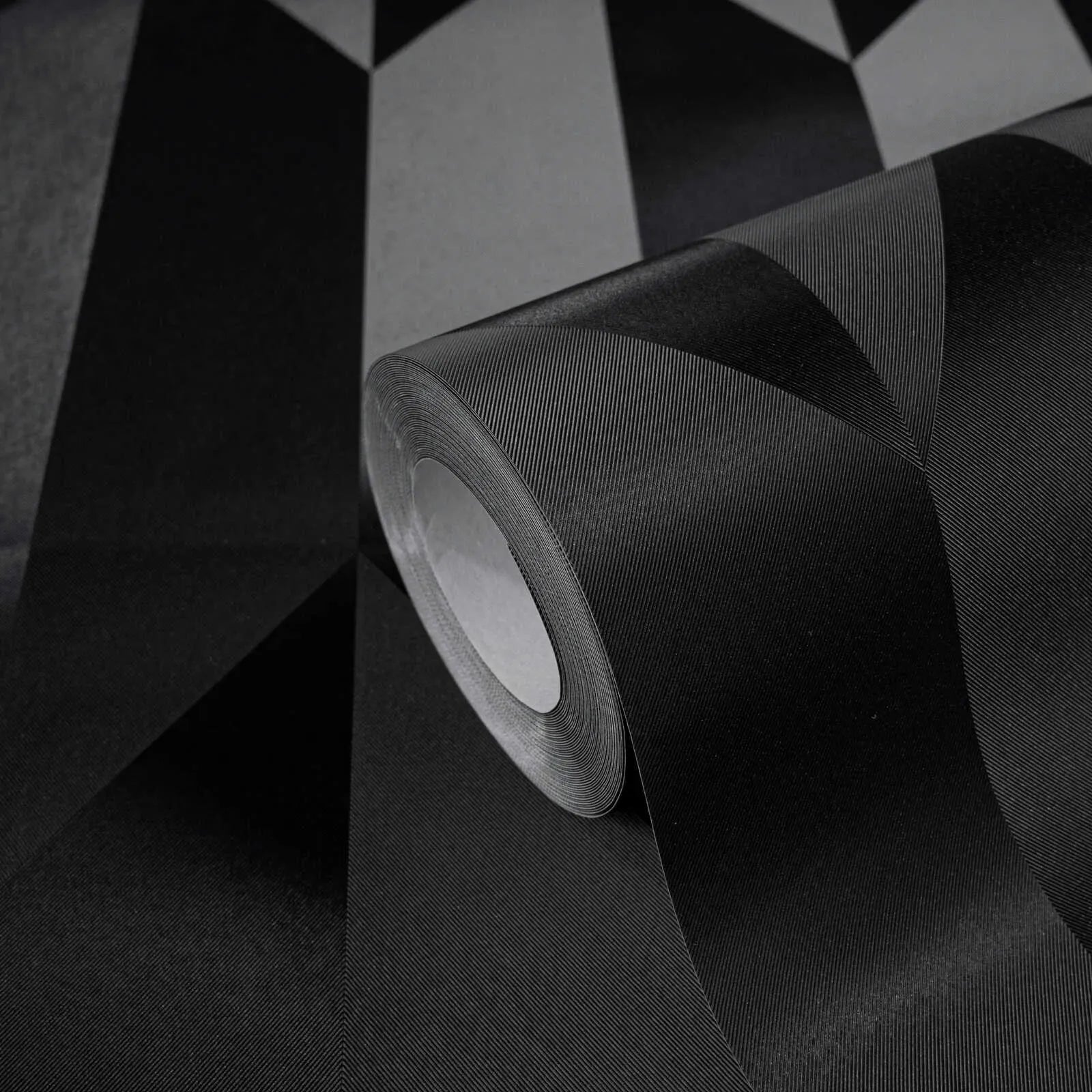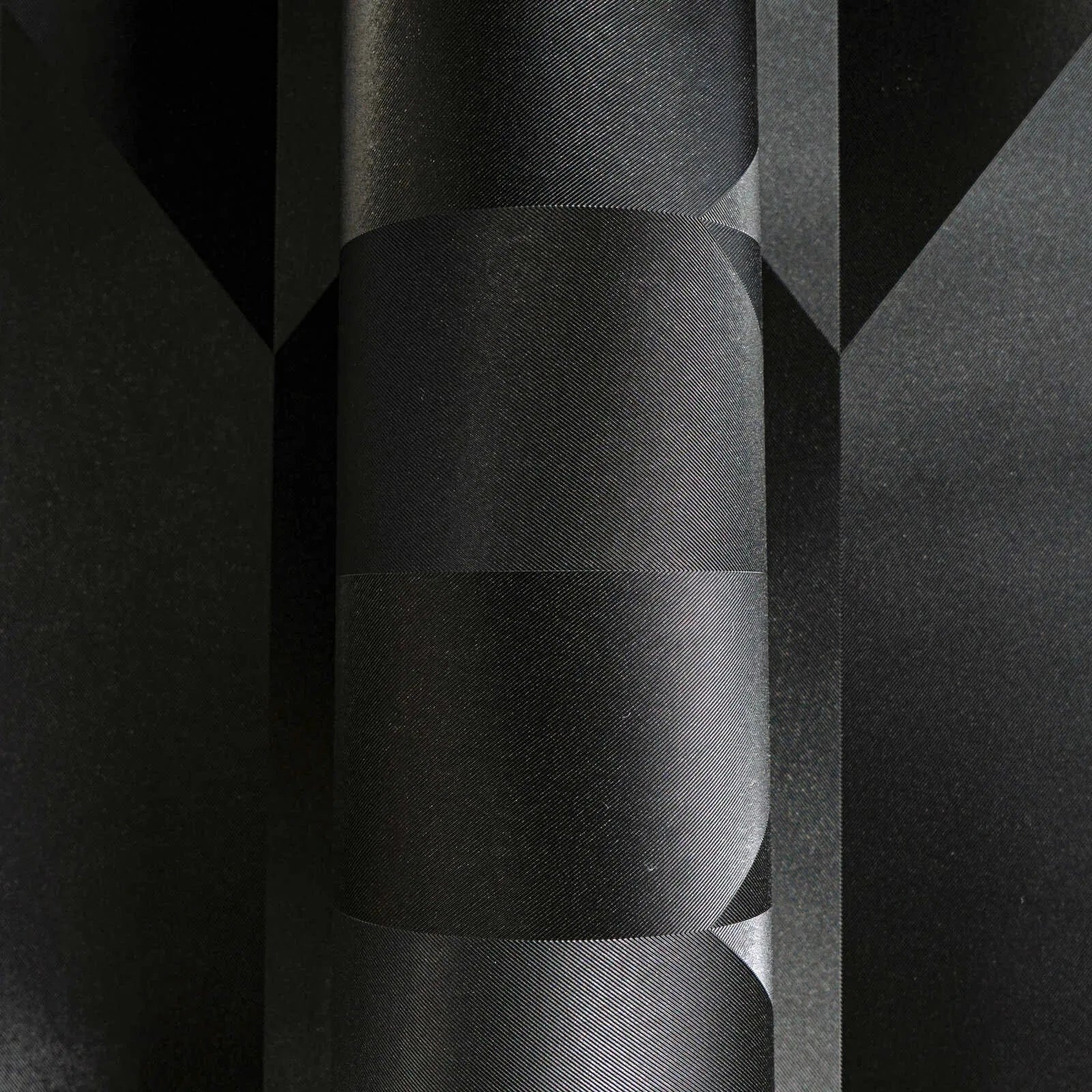 Обои Рисунок состоят из строго геометрического расположения ромбов и параллелограммов, повторяющихся по вертикали. Каждая секция состоит из разных оттенков черного и антрацитового, что создает тонкий 3D-эффект за счет изменения расположения поверхностей: создается впечатление краев и складок, как будто поверхности сложены в трехмерном пространстве. Цвета представлены исключительно в темном спектре, создавая элегантную, изысканную и современную атмосферу. Внешний вид чист, минималистичен и сдержан, но в то же время подчеркивает графический рисунок за счет игры света и тени. Эффект одновременно роскошный и авангардный - идеальный выбор для помещений, где необходим сильный эффект глубины и экстравагантности.