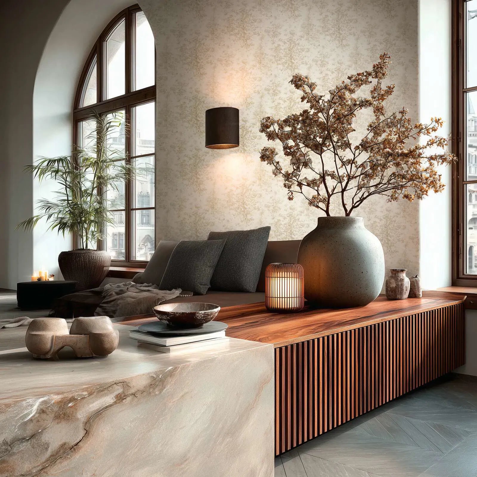 Деликатный, почти прозрачный мотив дерева, напоминающий акварельный или сепийный рисунок. Силуэты деревьев с нежными ветвями и свободно расположенными листьями неравномерно разбросаны по поверхности. Цветовая палитра мягкая и теплая, в ней преобладают нежные песочные и бежевые тона, которые гармонично сочетаются со светлым кремовым фоном. Обои создают успокаивающий и легкий эффект, излучая естественную, сдержанную элегантность и напоминая туманное утро в ярком лесном пейзаже. Взаимодействие узоров и цветов придает помещениям спокойную, уютную атмосферу и создает ненавязчивый, современный фон, который можно комбинировать различными способами.