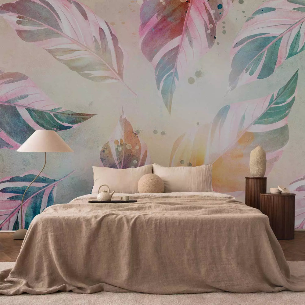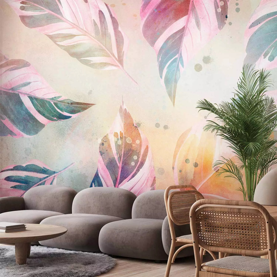 Фотообои Поэзия природы - розово-зеленые листья на красочном фоне, 143786