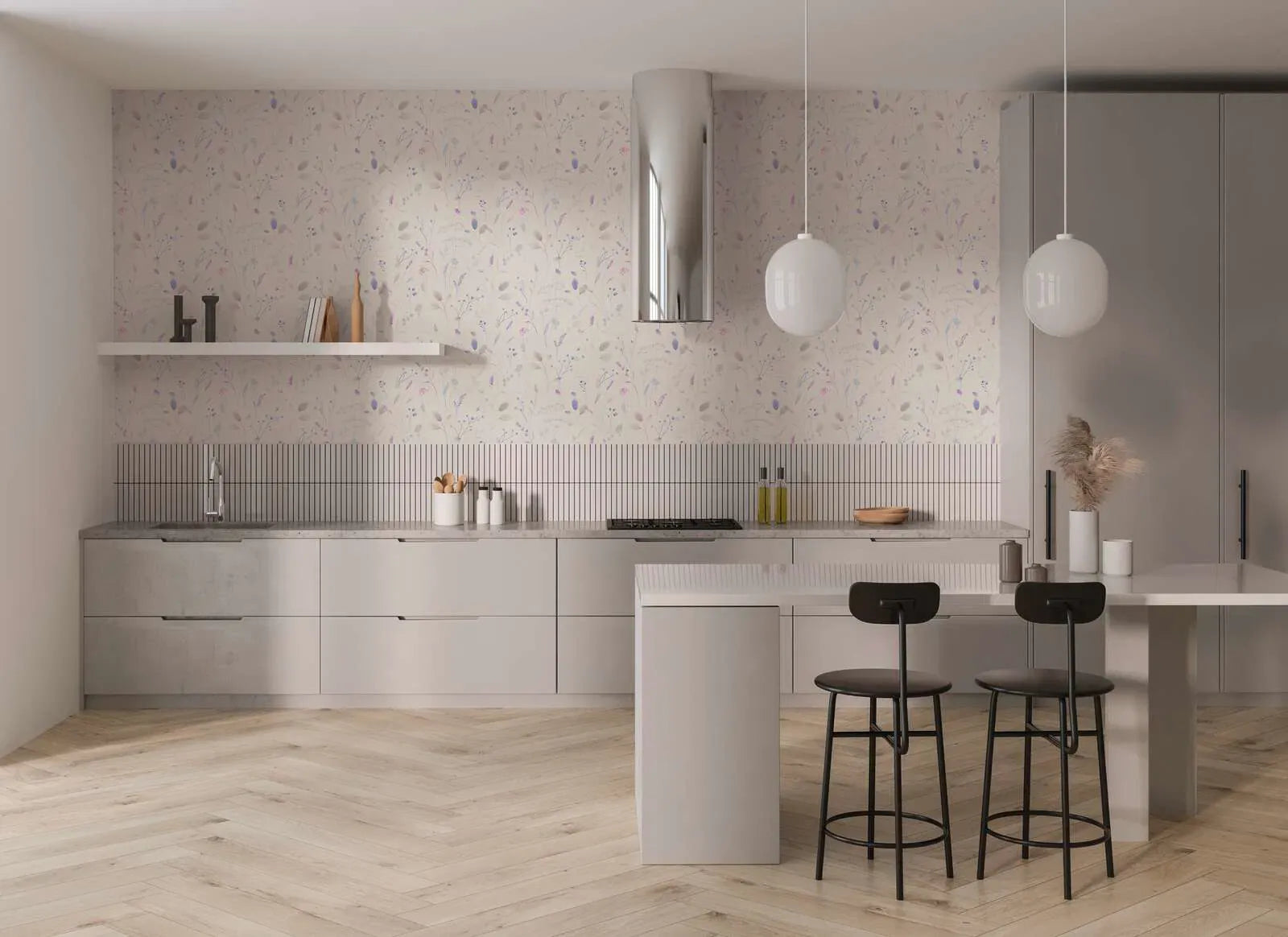 Деликатные цветочные мотивы на светлом кремовом фоне характеризуют дизайн этих обоев. Узор состоит из тонких акварельных рисунков с листьями, нежными стеблями и маленькими цветами, некоторые из которых сияют нежными фиолетовыми, нежными розовыми и светлыми лавандовыми оттенками. Контуры растений иногда более выраженные, иногда едва заметные и кажутся почти прозрачными, придавая общему изображению воздушный и легкий вид. Отдельные листья и бутоны придают игривые акценты пудрового фиолетового и светло-голубого цвета. Текстильный характер фона с тонкой текстурой придает дополнительную глубину и создает изысканную, естественную атмосферу — идеально подходящую для придания помещениям дружественной и спокойной атмосферы с легким, поэтическим оттенком.