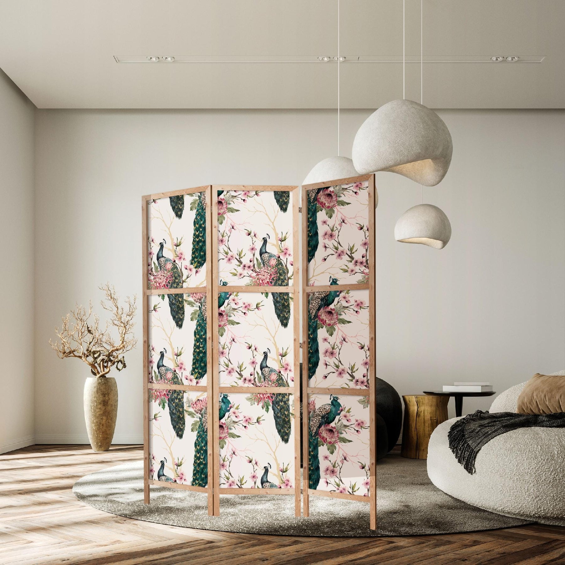 Dekoratīvs japāņu aizslietnis, vienpusējs 135x172, Pāvi un pavasara ziedi